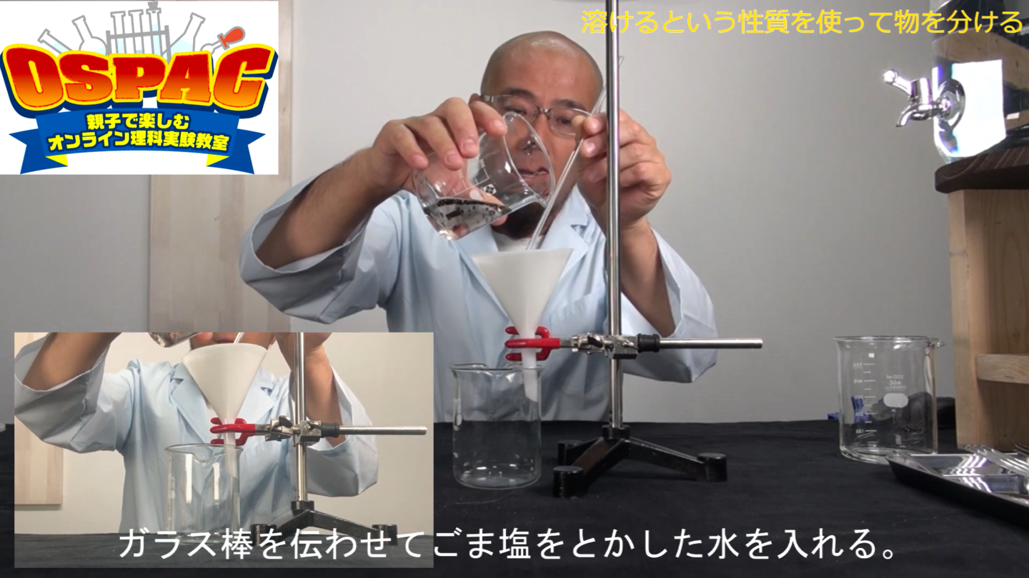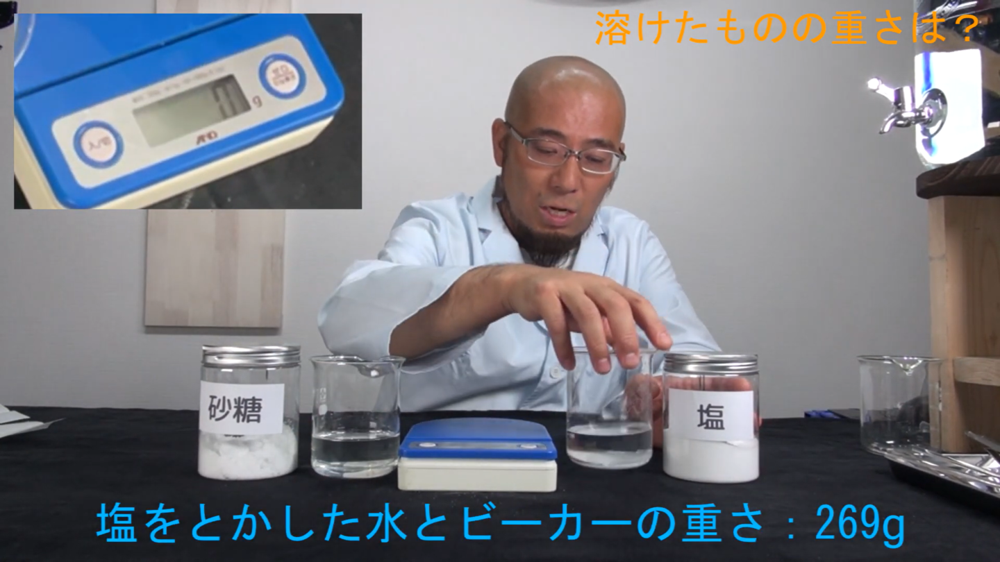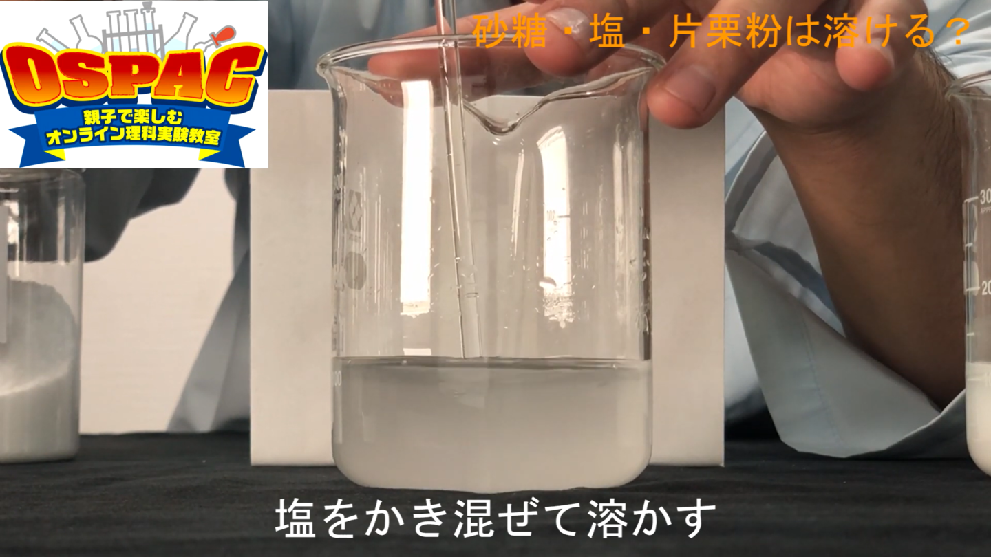 | 実験に必要な物 | ご家庭にあるもの、もしくは簡単に手に入る物を使い実験いたします。 ・はかり ・計量カップ ・わりばし、スプーン 各4本 ・A4用紙 3枚 ・ガラスコップ 4個 ・塩、砂糖、片栗粉 各100 g ・ゴマ塩、ゴマ 少々